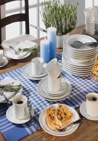„6 x Obertasse 0,19l, 6 x Untertasse 14 cm, 6 x Frühstücksteller 20 cm, 6 x Speiseteller 24 cm, 6 x Suppenteller 23 cm, 6 x Becher 0,25l“