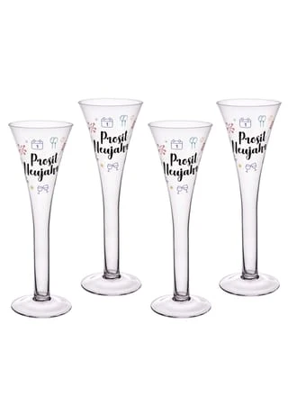 Die Gläser von GRÄWE verfügen über ein flottes Design mit der Aufschrift „Prosit Neujahr“ und verbreiten mit ihren bunten Bildern gute Stimmung. Die Gläser sind jahresunabhängig und können so jedes Jahr auf´s Neue verwendet werden. Material: Kristallglas Bleifrei Mundgeblasen Aufdruck aus hochwertigen `Decal`-Abziehbildern Aufschrift „Prosit Neujahr“ in schwarz Bilder (Luftballons, Silvesterknaller, Weingläser, Kalenderblatt „1“, Hütchen, Fähnchen in gelb, rot, hell- und dunkelblau) Jedes Jahr verwendbar Form: trichterförmig Lieferumfang 4 Sektgläser „Prosit Neujahr“ 260 ml Abmessungen: Höhe ca. 26 cm, Durchmesser oben ca. 8,7 cm, Durchmesser Fuß ca. 8,6 cm, Gewicht ca. 150 g (1 Glas)