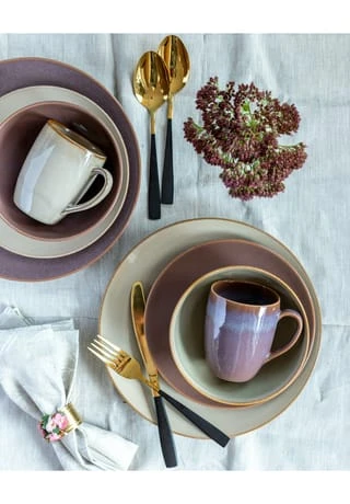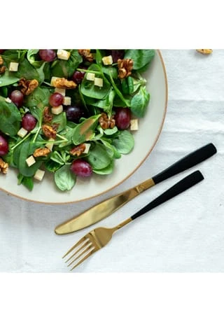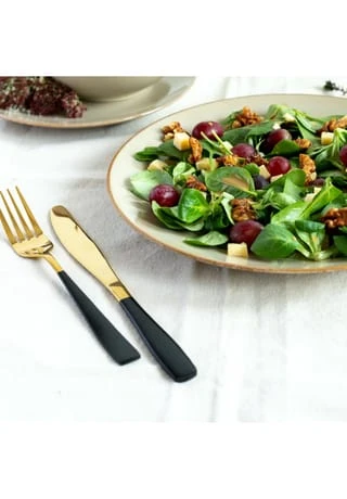 Dieses goldfarbene Besteck-Set mit mattschwarz lackierten Griffen ist der Eye-Catcher auf Ihrem liebevoll gedeckten Tisch. Mit ihrer modern-schlichten Linienführung, den schlanken Formen und den absolut trendigen Farben verleiht die Besteckserie LAUSANNE der österreichischen Traditionsmarke MÄSER Ihrem Tischauftritt wunderschöne Akzente – vergleichbar mit einem sorgfältig ausgewählten Mode-Accessoire, das zum Blickfang Ihres Outfits wird. Lassen Sie sich überraschen, wie vielseitig Sie diese Besteckgarnitur kombinieren können: Von der elegant gedeckten Festtafel bis zur modernen Wohnung im Vintage-Look verzaubert die Serie LAUSANNE Ihre Gäste mit dem gewissen Etwas. Gefertigt aus Chromstahl, spülmaschinenfest, rostfrei. Bestehend aus • 6x Suppenlöffel (20,5cm/45g) • 6x Essgabel (20,5cm/35g) • 6x Tafelmesser (23cm/77g) • 6x Teelöffel (13,5cm/20g)