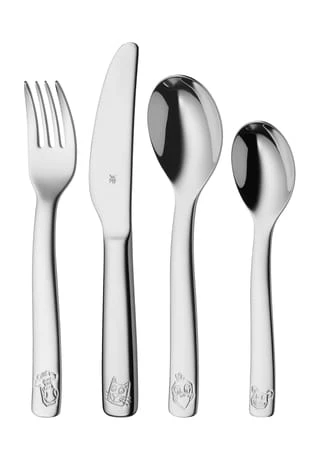 Je mehr Spaß die Kleinsten beim Lernen haben, desto schneller lernen sie auch. So ist es auch beim Essen. Das 4-teilige WMF Kinderbesteck-Set Bauernhof mit bezaubernden und Gravuren aus der Tierwelt eines Bauernhofs ist für Kinder ab 3 Jahren geeignet und besteht aus Kindergabel, Kindermesser, Kinderlöffel und kleinem Kinderlöffel mit wunderschöner und kindgerecht ungefährlicher Formgebung. Aus hochwertigem, strapazierfähigem, spülmaschinengeeignetem und hygienischem Cromargan®: Edelstahl Rostfrei 18/10 gefertigt, ist es perfekt für kleine Kinderhände geeignet. Und für große Träume auch.